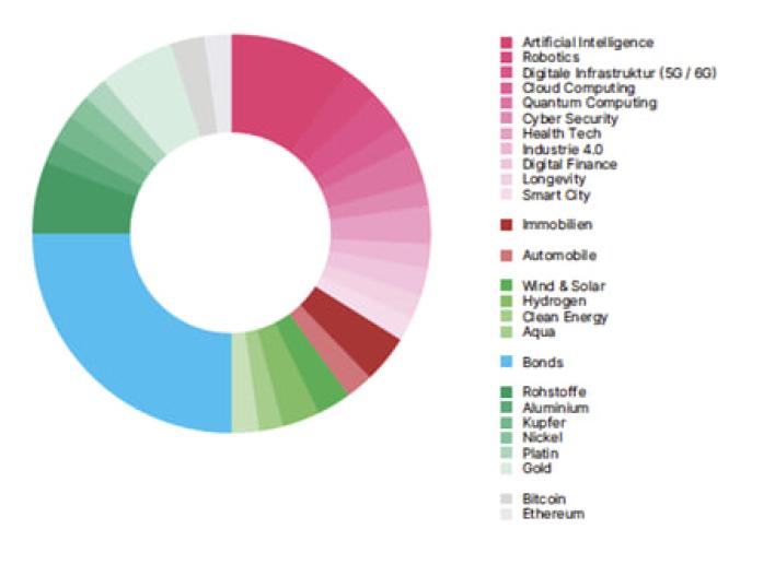 - Aktien Zukunftsthemen (40%): KI, Robotik, Cloud Computing, Cyber-Security.