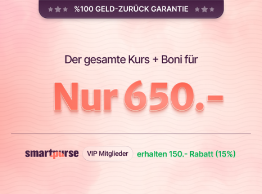 Der SmartPurse VIP Coaching Club ist eine exklusive Community, in der du persönliches Coaching, praxiserprobte Tipps und Zugang zu wertvollen Ressourcen erhältst, um deine Finanzziele zu erreichen. Wir treffen uns jeden Montag von 19:30 bis 20:30 Uhr, und monatliche Masterclasses mit Top-Expert:innen bieten dir zusätzliches Wissen und Inspiration. Der Club ist ideal für alle, die langfristig erfolgreicher sein wollen. Als Teil dieses Kurses kannst du den Coaching Club für 6 Monate kostenlos nutzen!