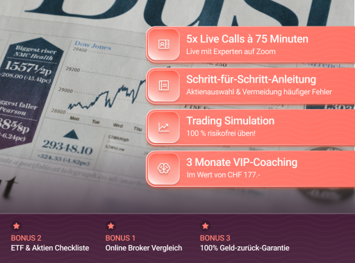 Bonus:  Online Broker Vergleich, Checkliste für Anlage mit ETFs, Aktienlisten, exklusive Gruppe von max. 30 Teilnehmer:innen, Geld-zurück-Garantie