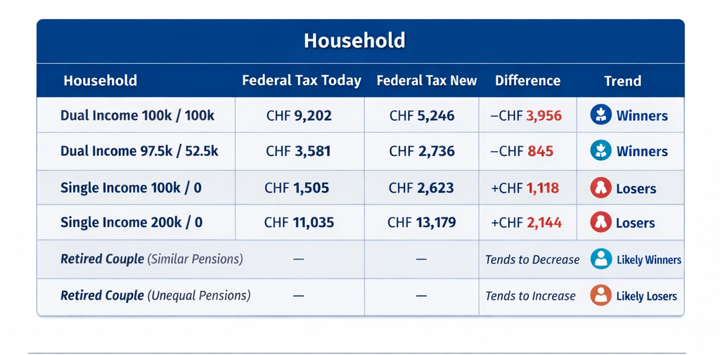 Until now, Switzerland taxed married couples jointly. It sounds simple—but there’s a major drawback: when two incomes are combined, you quickly move into a higher tax bracket. Taxes increase disproportionately.