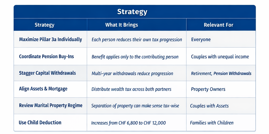 - Maximise Pillar 3a individually → lowers personal tax rate
